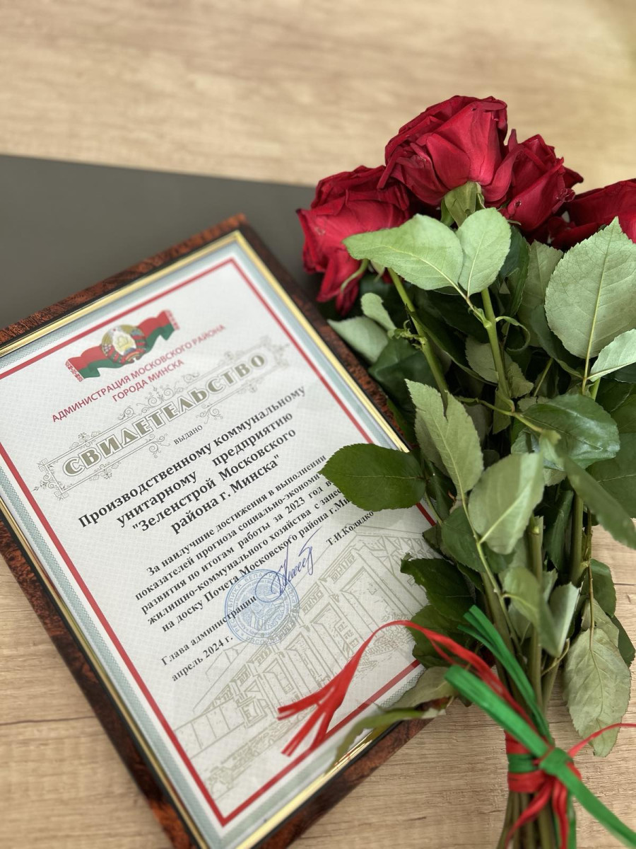 По итогам работы за 2023 год УП «Зеленстрой Московского района г.Минска» признана лучшей организацией в сфере жилищно-коммунального хозяйства и занесена на доску Почета Московского района г.Минска.