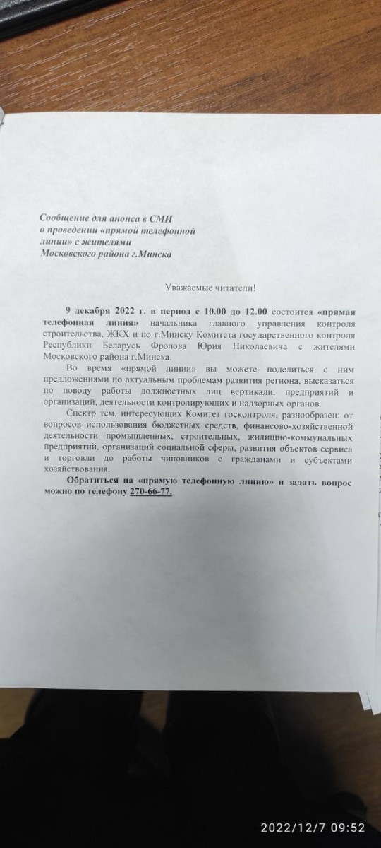 "Прямая телефонная линия" с жителями Московского района г. Минска